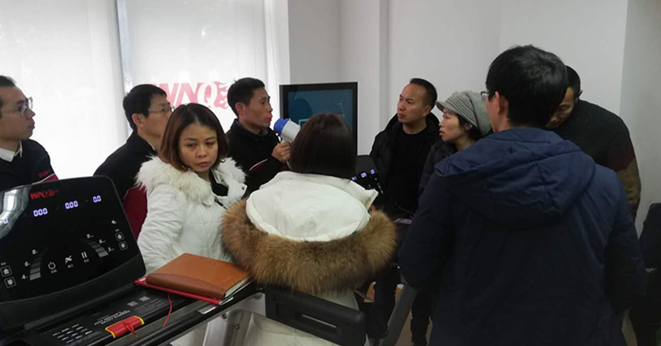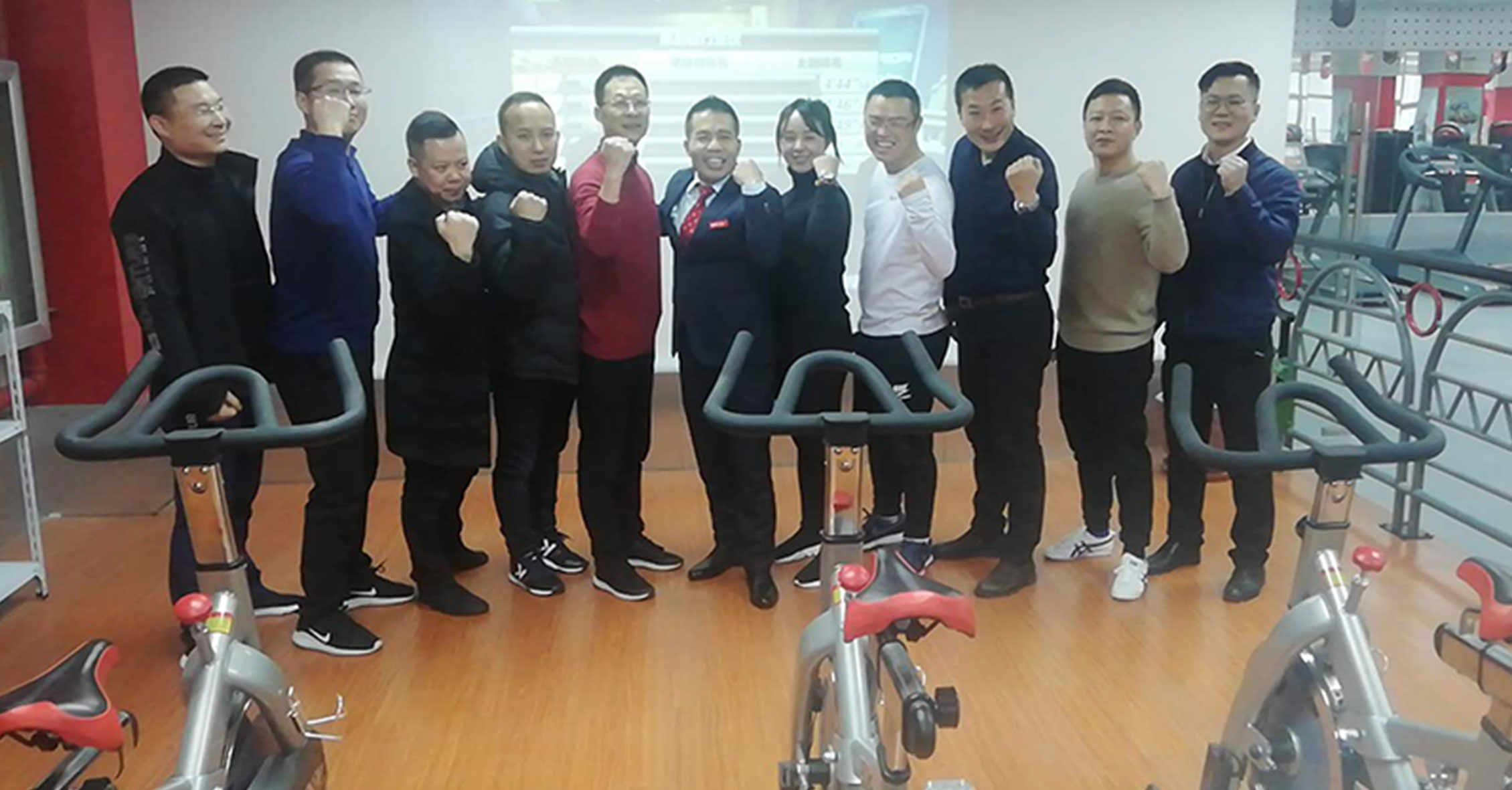 在展廳,我司組織了一場單車競賽,經銷商們踴躍參與。最新開發的單車競賽系統給單車競賽增添了許多新的趣味。比賽過程中大家高喊助威,最終前三名都獲得動感單車獎勵!